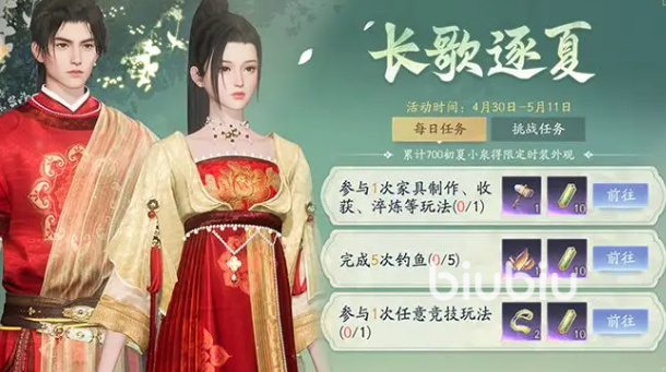 长歌逐夏,时间为4月30日到5月11日,参与条件是达到30级,大家在这一期间只要完成指定任务就可以领取,限定时装外观长安歌、寻武令等奖励内容,然后是发财有树,时间是4月30到5月13日,在这个期间满30级的玩家可以购买摇钱树进行栽培。