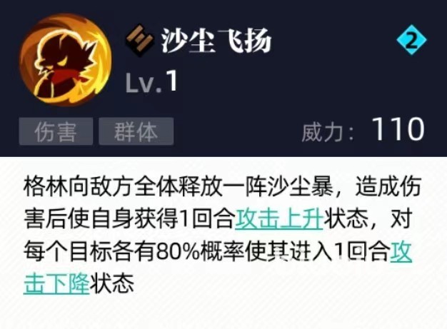 三技能属于一个群体伤害型效果,并且能够附加增益状态可以向敌方全体释放出沙尘暴,在造成伤害后自身获得攻击上升状态。提高接下来一回合攻击所造成的输出,同时使得伤害目标有极高几率进入攻击下降状态,相当于提高了自己的输出,削弱了攻击目标伤害。并且作用目标是敌方全体,也有很大几率将对方全部削弱,这对于整个队伍来说也是很有好处的。