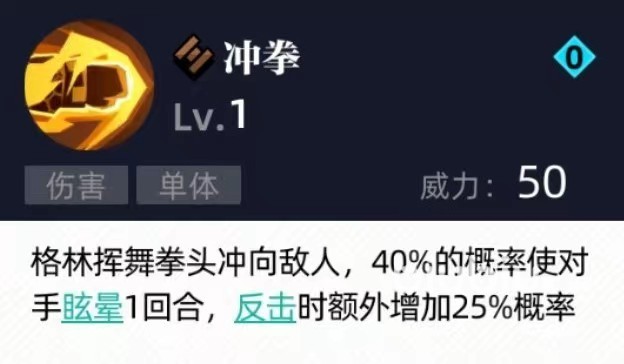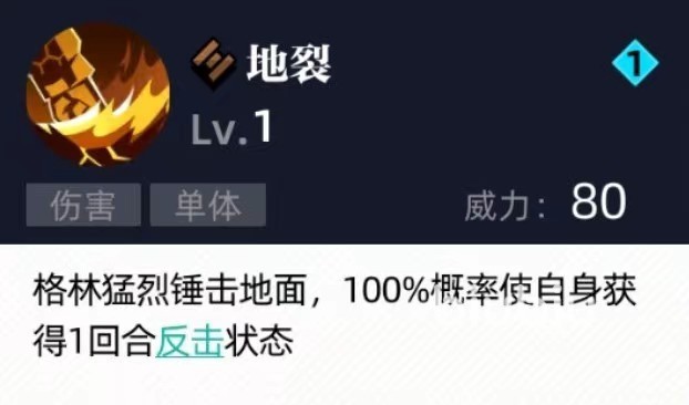 二技能同样是单体伤害,但是并没有附加控制而是提高增益效果,猛烈锤击地面后必定会使自身获得反击状态,持续一回合。此技能和一技能就可以很好结合起来,自带反击状态能够提高一技能触发几率。此外在反击状态持续的这一个回合里,一旦受到对方的攻击还有几率直接进行反击,虽然触发的是普通输出,但是也多了一些可以攻击的手段。在使用的时候也要注意顺序,一般先释放二技能之后再接上一技能,这样基本上可以做到必定使对方眩晕,无论是单杀还是合作都是很好选择。