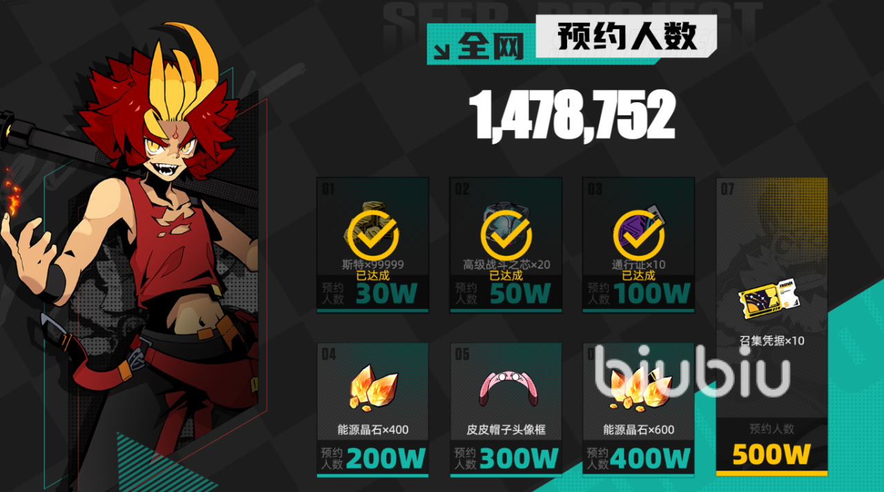 2、预约人数达到50W:奖励高级战斗之芯x20个。