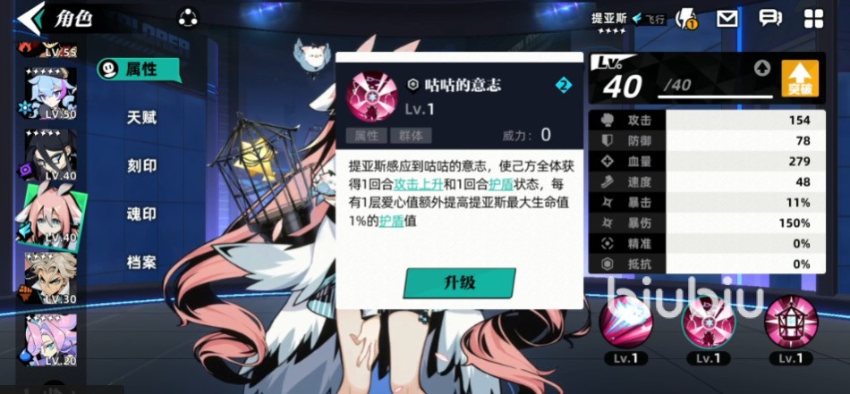 而她最后一个技能是角色与咕咕合二为一,这时候会用掉积攒的所有爱心值,每次用掉一层这次能够输出的伤害就会得到相应的提升。如果角色在攻击前,自己的爱心值有达到五层,那么对敌方每个人都会有概率添加防御下降的效果。