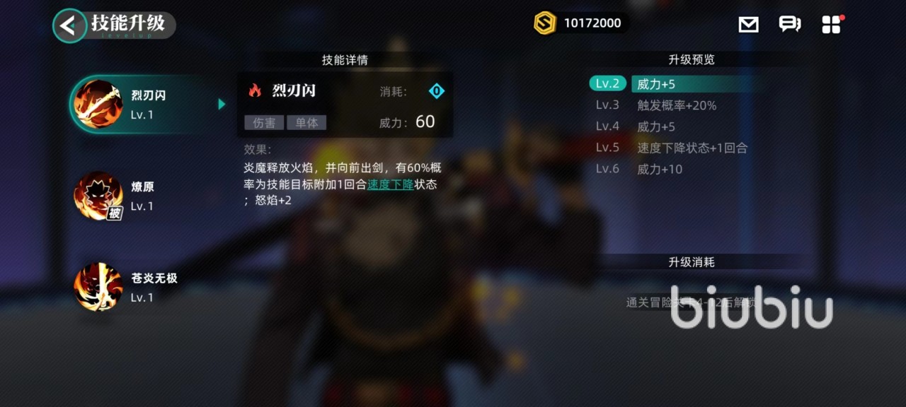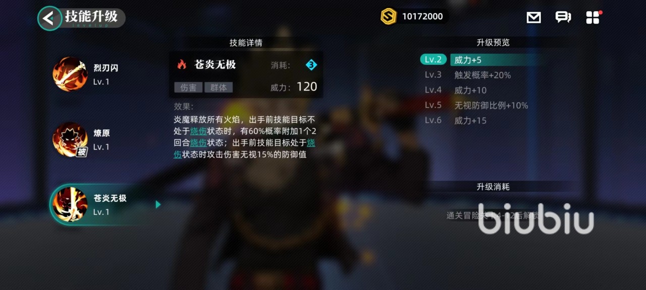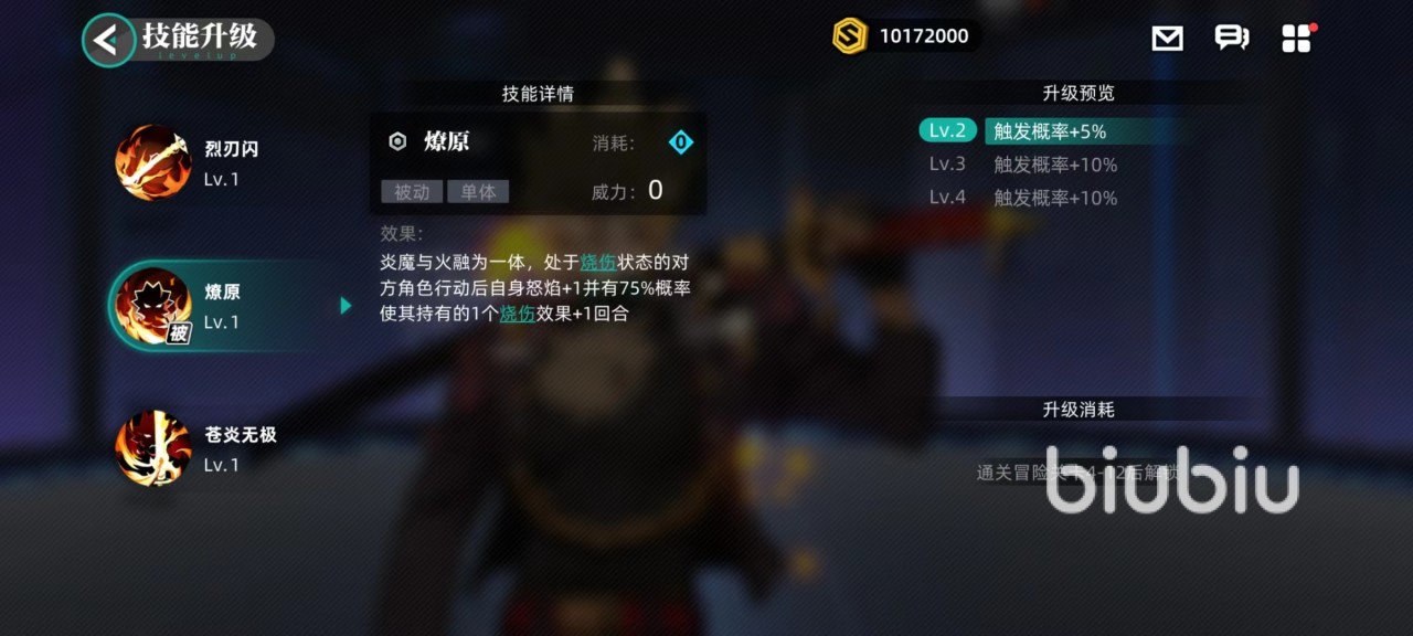 第2个技能燎原,让炎魔和火焰融为一体,如果对方有处于烧伤状态目标,在其行动后,炎魔自身怒焰效果增加一层,并且有机率使其身上烧伤效果延续一回合。这是一个被动生效单体类技能,对于拿手好戏烧伤来说非常有效,只要脸好甚至可以一直将效果延续下去,对方会非常头疼。而且这也是自身可以造成的状态,被烧伤影响目标持续减少生命值和攻击力。