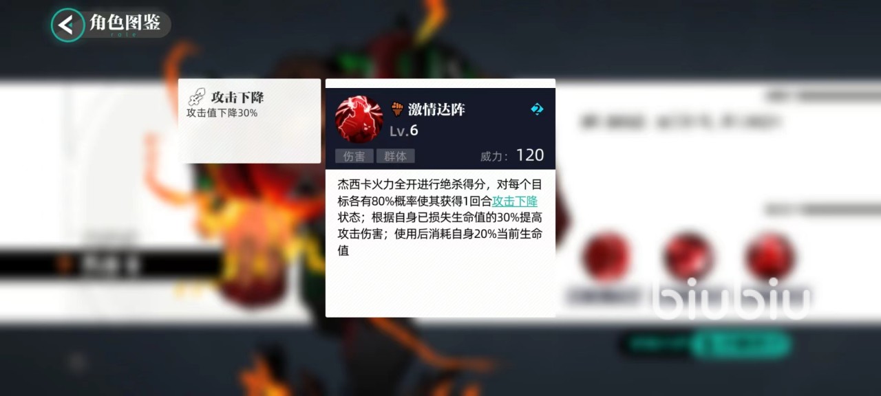 最后一个技能使得杰西卡将自身火力全部释放出来,对群体中每一个目标都造成伤害,并且使其进入到攻击下降状态,最多能下降30%攻击值,对削弱敌方输出方面有很好作用。并且根据自身已经损失生命值计算,按照比例提高攻击伤害,在此技能使用后会继续消耗当前生命值。所以该角色的很多效果都需要以牺牲血量为代价才能实现。