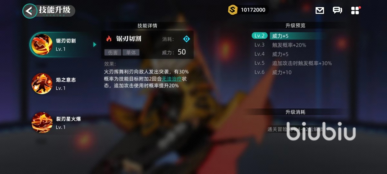 火刃虽然初始只有4星,但是自身外观非常霸气,这也为其赢得了很多人的喜爱,并且可以通过后面强化继续升级战力,所以千万不要因为星级低就放弃养成。相反对于平民玩家来说,四星角色在很多时候更加值得培养,因为成型快输出高。第1个技能锯刃切割,向敌方发动突袭后,除造成伤害外有几率使对方获得无法治疗效果,在此效果影响两个回合内无法回复任何生命值。如果该技能在追击状态下使用,则附加概率再次提升。这个技能就能很好限制住对方治疗角色,尤其是对现在比较热门的始祖兽,更是极其克制。