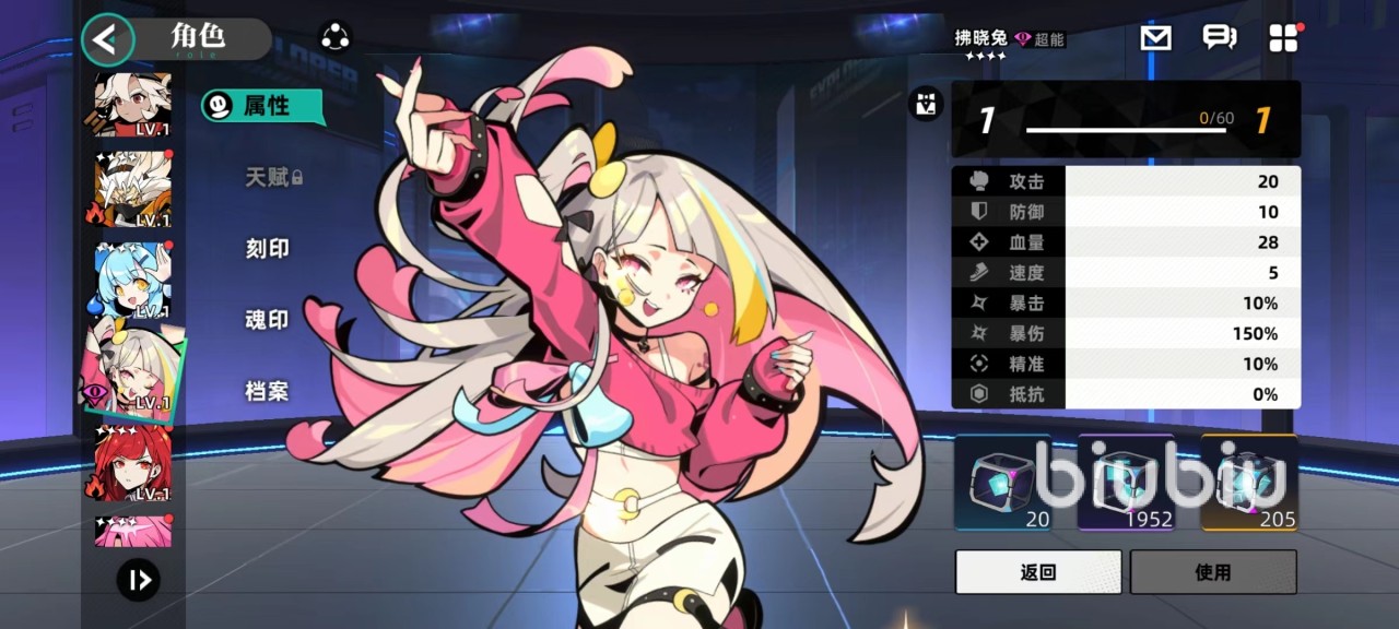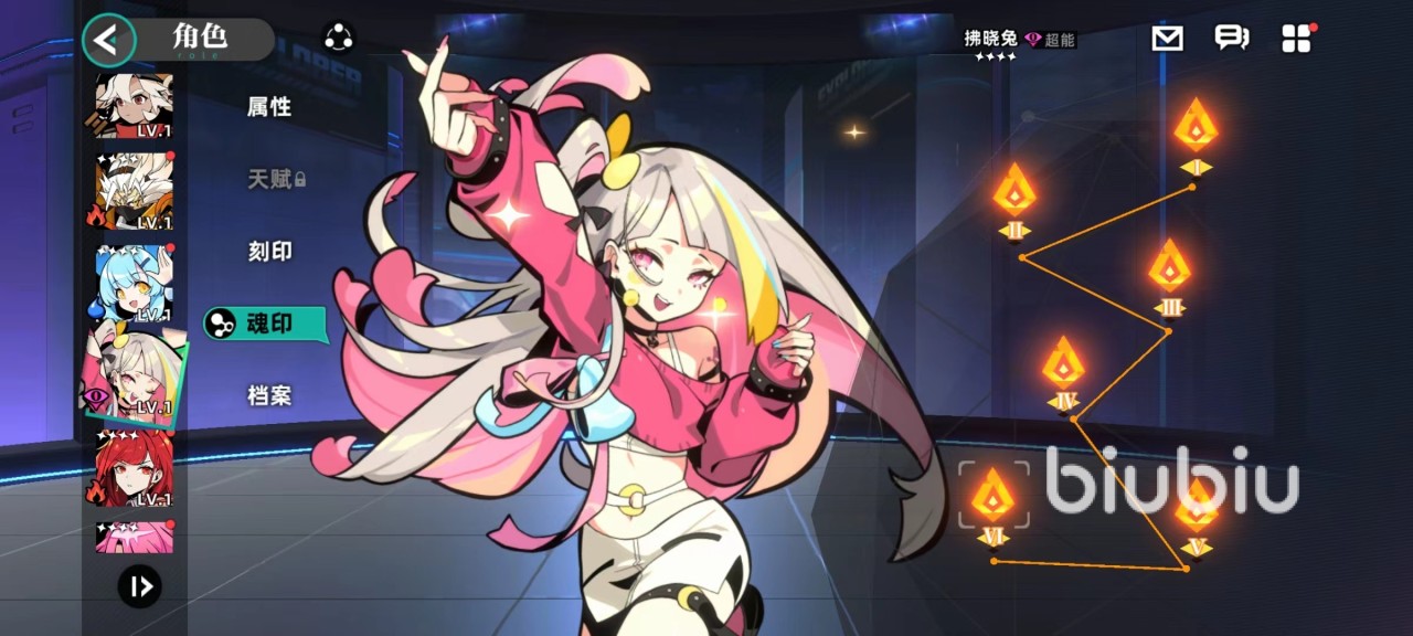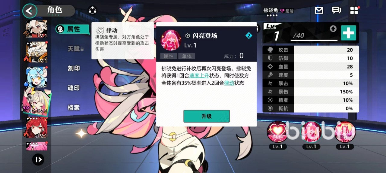 拂晓兔作为一名四星角色,外观非常迷人可爱,所以拥有不少粉丝,自身三个技能也很有特点。第一个单体伤害技能心动冲击,向对方发动冲击波之后,除了伤害之外还有几率使对方进入到无法强化状态,因为在该游戏战斗过程中很多技能都会附加各种各样强化状态,例如速度提升,攻击提升或其他类型。一旦无法强化,战斗力下降很快,并且此技能还将对处于律动状态目标有额外几率加成,律动是拂晓兔专属效果。由第2个技能闪亮登场附加。