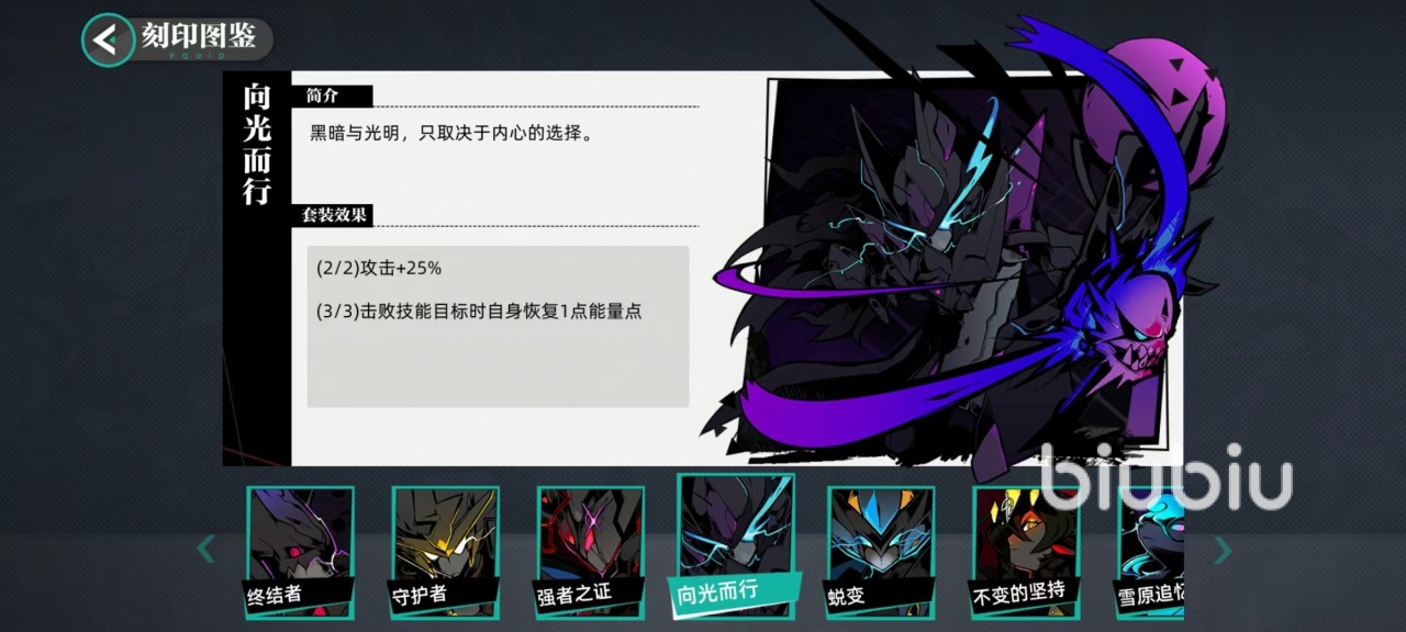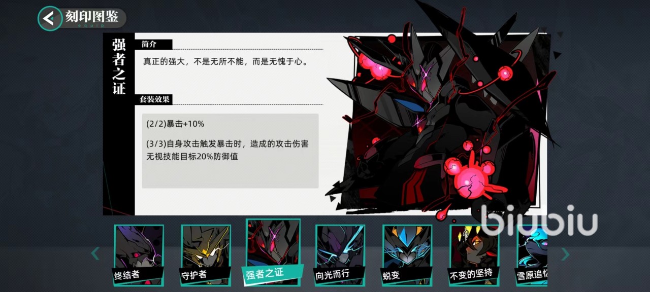 在所有套装效果中,小编最推荐有终结者,守护者,强者之证,向光而行这几个,第1个终结者,两件套效果可以提高暴击率,三件套时如果出手前对方血量过低,则能附加技能威力加成,非常适合单体输出比较强的角色选择,能够在敌方血量比较低情况下快速完成收割。第2个守护者,两件套提高攻击力,三件套能在攻击前进行判定,如果对方身上带有异常状态,则提高技能威力,游戏中很多角色都附加有异常状态,所以几乎相当于常驻威力提升。