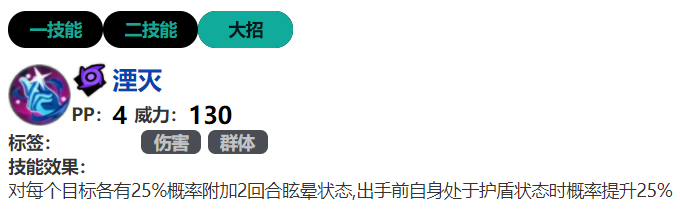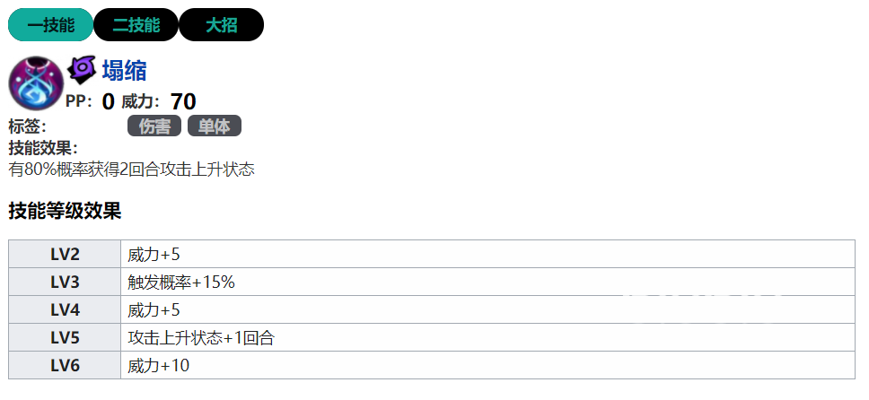 普通的攻击是坍塌,威力有七十但是有概率触发上升状态,在游戏里面作用不大,所以这个技能只有在增加pp的时候有用,一般要以二技能为主。