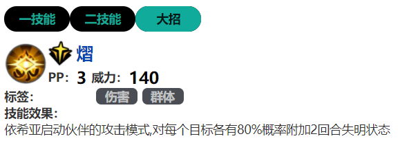 最后大招是消耗三行动点的140威力群体技能,并且可以触发被动的效果,因为大招能够大范围的造成失明,依靠这些效果大家就能玩失明队伍让对方痛不欲生了,但是对有些怪物可能无法生效,大家要看一下某些怪的效果提示。