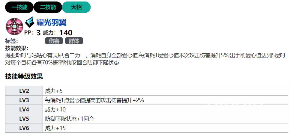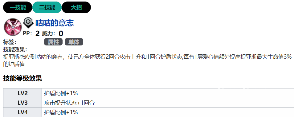 二技能可以提攻击和护盾的效果,并且爱心数值越高生命提升越大,所以这个角色作为前排非常的不错,有了这个技能就更加的强大了。