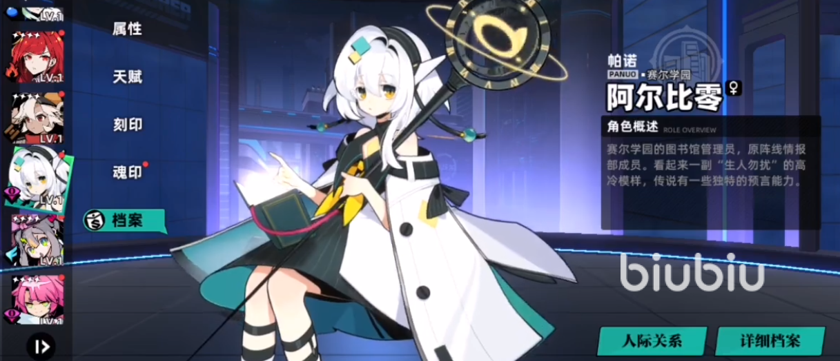 阿尔比零是学院里面的图书管理员,原属于情报部门,与里奥斯是好友的关系,拥有预知未来的天赋。在游戏对局里面作为队伍里面的功能增益减益辅助,可以减少对方强化buff,同时清除己方异常buff,大招为全体队友增加攻击力,同时清除两个异常状态。