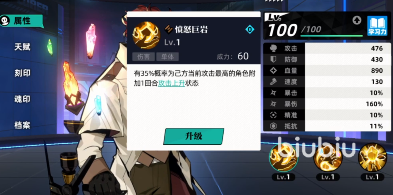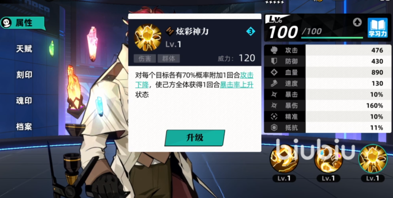 最后大招属于他的核心,概率上升全员暴击下降对方的攻击,属于能够改变战局的效果,升到满级有150的威力,输出的同时为下一次进攻做好准备。