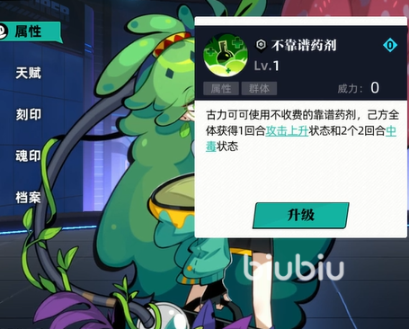 2技能不靠谱药剂,是该角色的属性增益技能,提高自身攻击属性以及中毒状态,该技能一般需要先手释放,这样后续的技能效果才能更强。