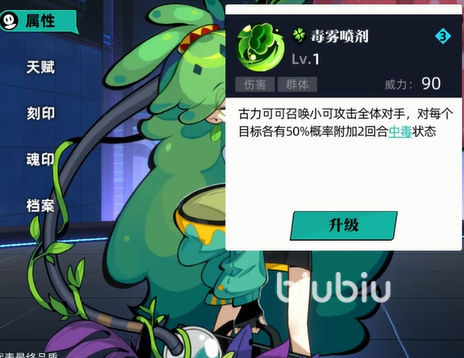 3技能毒雾喷剂可以召唤一个植物,该植物可以随同攻击,在开场的时候能造成范围伤害,并有百分之50的概率让敌方处于中毒状态。