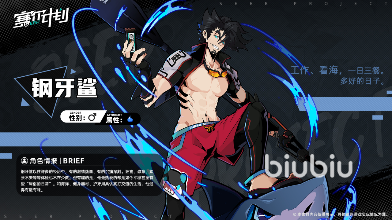 钢牙鲨在人设上是一个过着平静生活的肌肉男,任职于尼普特城一家饭店,经常招待来自五湖四海的游客,对于每个人都比较热情,但是他的往事没有人知道,似乎隐藏着很多不为人知的秘密,不过他现在只想过着平静的生活,