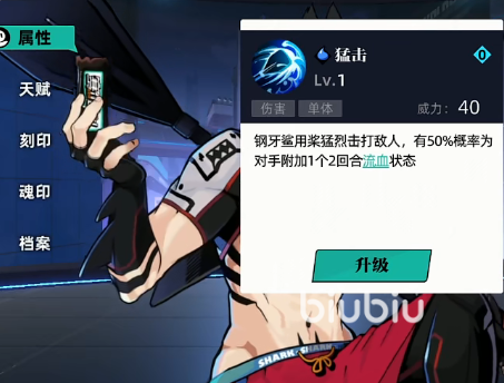 钢牙鲨的技能多数都是跟流血状态有关,1技能对敌方造成伤害后有一定概率提供流血效果,这个效果可以持续扣血,在前中期的表现不错,但是后期流血状态的扣的血不多了。