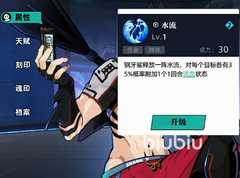 大招鲨鱼来哦是核心技能,对敌方单体造成一次高额伤害,如果敌方处于流血状态的话,还可以额外造成自身百分之30的攻击力,对于钢牙鲨这种攻击属性成长高的角色而言,该技能中到脆皮基本上就是秒杀了。