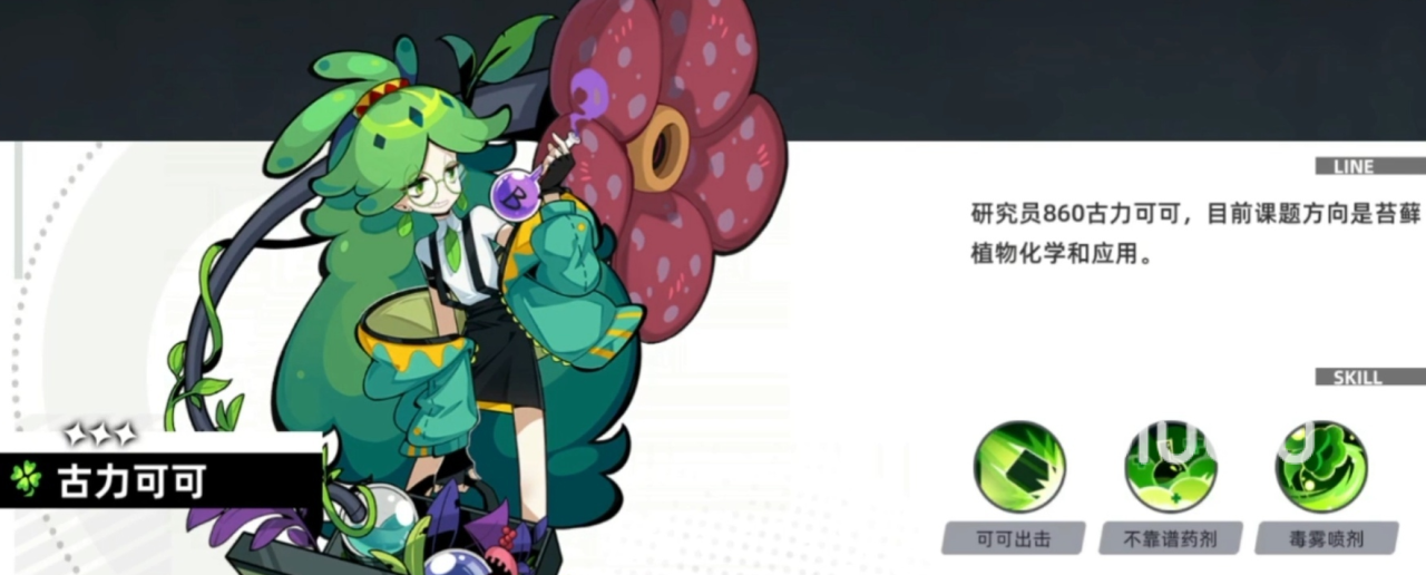 古力可可在人物设计上是一个喜欢研究各种植物的眼镜少女,平时喜欢对各种植物的特型进行研究,从而制作出更加古怪的药水,性格上也比较古怪,技能模组的设计也跟她的设定符合。
