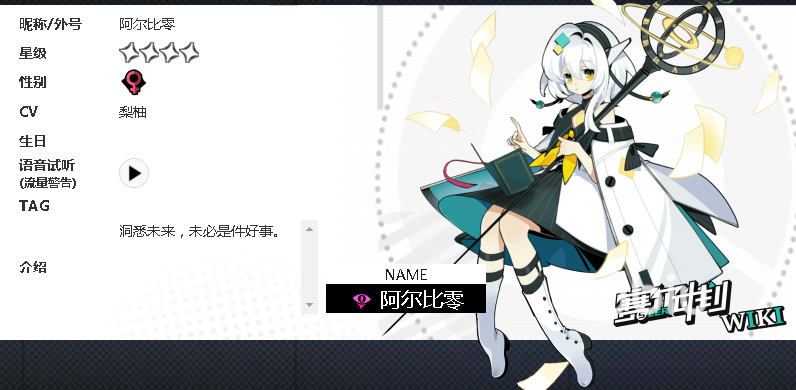 第四个要给大家介绍的角色是阿尔比零,这个角色看上去稍稍有一些文静,但是输出能力还是很不错的,使用技能的时候有一定的概率可以使敌方陷入弱化状态,并且能够解除队友的一定弱化效果,属于一个比较强大的辅助型角色。