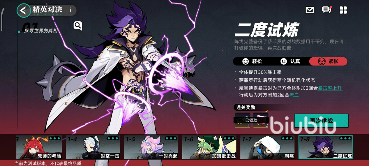 2、玩法攻略:这一关基本就是考验玩家的配置,想要低配置过关,那么玩法思路就和之前1-7是差不多的。刚才提到了萨菲罗在回合结束后会给自己附加两个增益状态,因此如果随机增益中有“免疫”状态,那么就需要重开才行,有免疫就无法给他上减益debuff。其他的增益一般都是可以接受的,即便是反击也可以。