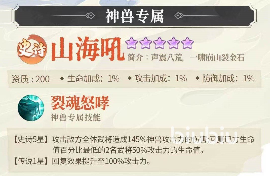 玩家可以在游戏中点击千机阁,然后在这里找到唤兽镜,使用游戏中的万兽铃,就可以通过唤兽的方式获得神兽。每一只神兽都是唯一,重复获得之后将自动兑换成碎片用于升星。山海吼是属于史诗级别的神兽,他的资质200,生命加成1%,攻击加成1%,防御加成1%。专属技能是裂魂怒吼,当星级达到史诗五星时,效果是攻击敌方全体武将造成145%攻击力的伤害,同时会选择己方两个生命值百分比最低的武将,为其恢复50%攻击力的生命值,当升星到传说一星时,回复效果提升至100%攻击力。