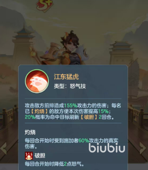 有20%的几率为命中目标施加2回合破胆,破胆效果会让持有者每回合开始时降低2点怒气,从而降低放大招的频率,他的天赋技会在场上敌我双方有任意武将阵亡时,回复2点怒气,传说2星能激活10%生命加成,传说3星能带有10%防御加成。