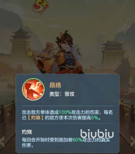 孙策的普攻技“昂扬”会攻击单个目标造成100%攻击力的伤害,场上每位陷入灼烧的敌人都会让本次伤害提升5%,他的怒气技“江东猛虎”能攻击敌方前排,打出155%攻击力的伤害,每位已经陷入灼烧的敌人会使得本次伤害提升15%。