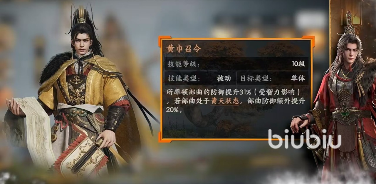 玩家在游戏中进行阵容组合的时候,一定要考虑到所有武将的定位和技能特点,这样搭配起来才能发挥最好的效果。黄巾盾的组合是张角、张宝和张梁,其中张角作为主将,张宝和张梁是副将,这是在pvp过程中非常强势的组合。张角的基础技能是黄天当立、诳时惑众和斗转参横。黄天当立的效果是对敌方造成一次直接伤害,同时提升部队防御力,持续6秒钟。诳时惑众使得自身主动技能伤害系数提升,在自身成功释放普攻后,有几率对于伤害范围内最多5个敌方目标附加嘲讽状态,持续5秒。