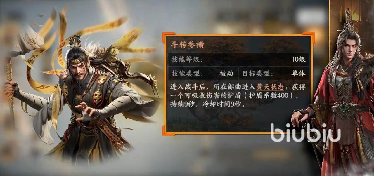 斗转参横的效果是进入战斗后所有部队进入黄天状态,获得一个可吸收伤害的护盾,持续9秒中.张角的作用就是嘲讽目标吸引伤害,然后为队伍提供强大的防御保证。张宝的基础技能是地公庇佑、黄巾诏令和太平道法。地地公庇佑能对敌方造成一次直接伤害,黄巾诏令使率领的盾兵部队防御提升,处于黄天状态下防御有额外的加成。太平道法使得部队在受到普攻时移动速度增加,这样方便在场上进行移动走位。