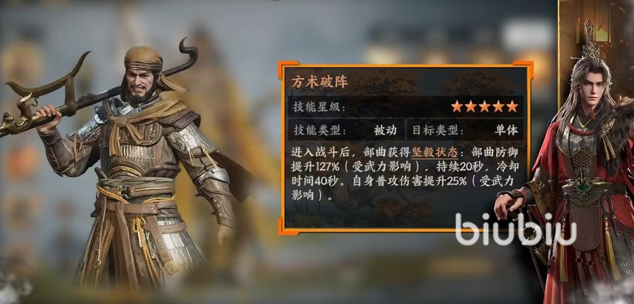 张梁的基础技能包括人公威震、符法乱军和黄巾捍卫。人公威震是属于直接伤害类型技能,符法乱军的效果是提升盾兵部队的防御能力,黄巾捍卫可提升自身主动伤害系数。这套阵容成型之后,张角优先释放主动技能,获得大量防御加成,然后利用提供的黄天状态配合上张宝的被动技能,获得额外防御加成。整体生存能力极强,面对战力高的敌人也有一战之力。