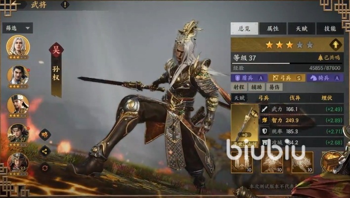 四维属性成长都比较优异,是一名优秀的辅助武将,适用于围绕弓兵队伍进行搭配。主动技“濡需抗敌”,可对大范围内敌方部曲造成损伤,根据敌方命中部曲数量,提高我方队伍其他武将技能伤害。被动“黄武即时帝”,额外提升主动伤害系数,,提升点数127,受到智力属性影响。“乘马射虎”是他的核心被动,主动技能使用后,有30%概率对命中的所有敌人施加易伤状态,还能提升自身队伍的防御力。