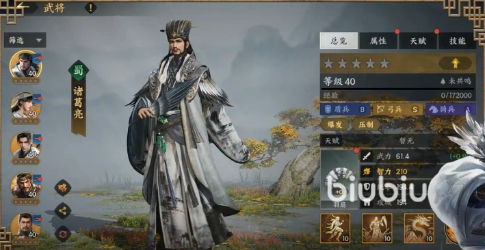 他拥有游戏里最高的智力成长,凭借高额单体输出,外加智力差增伤机制,是弓兵的核心输出。主动技“步罡踏斗”,对敌方单位造成1次直接伤害,以智谋碾压群英,根据自身与敌方智力最低武将的智力只差额外提升,每点智力差提升3.6。被动技在部曲兵力高于一定程度,他普攻伤害系数提高8.3。被动2“卧龙出山”,在受到普攻时,队伍防御力提高84%。