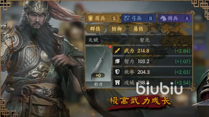 统帅和智力成长突出,是一个辅助型增伤武将,适用于骑兵或盾兵的阵容,同时其自身机动性也非常高。主动技“成霸安疆”,能对敌人造成直接伤害,同时使物理最高武将技能输出提升。被动1“短歌行”,受到普攻时队伍获得1层“枭雄”状态,可提升防御力,并使所有武将技能伤害都提升。被动2让率领部队骑兵移速提升,无论是集结还是追击都更加迅速。兵书技让部曲免疫所有减速效果,队伍兵力高于50%他的伤害增强,低于50%时提升防御,兵书满阶还解锁额外效果,可直接跃袭大范围目标。