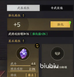 对于该武将来说,特技需要去找可以增加普攻伤害类型,或者直接增伤类型的特技,这类特技才有用因为他是骑兵定位,在确定属性后就需要按特技去寻找,在找到后就完成了石头的搭配了,不过只是找到了需要的石头而已,这石头需要找到两颗,因为武将可以装备两个。