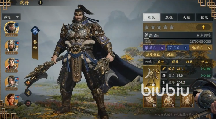 被动2“义占宛城”,所率领部队防御力提升110%,根据双方速度差提升闪避率,闪避成功能免疫普攻伤害,每20点速度差提升0.26%。兵书技“斩敌千里”,队伍成功闪避后,自身闪避伤害系数额外提升28%,防御力增强75%,他的技能伤害提高20%。这个武将拥有极高的速度收益,搭配具有移速增益武将,可获得更好战斗效果。