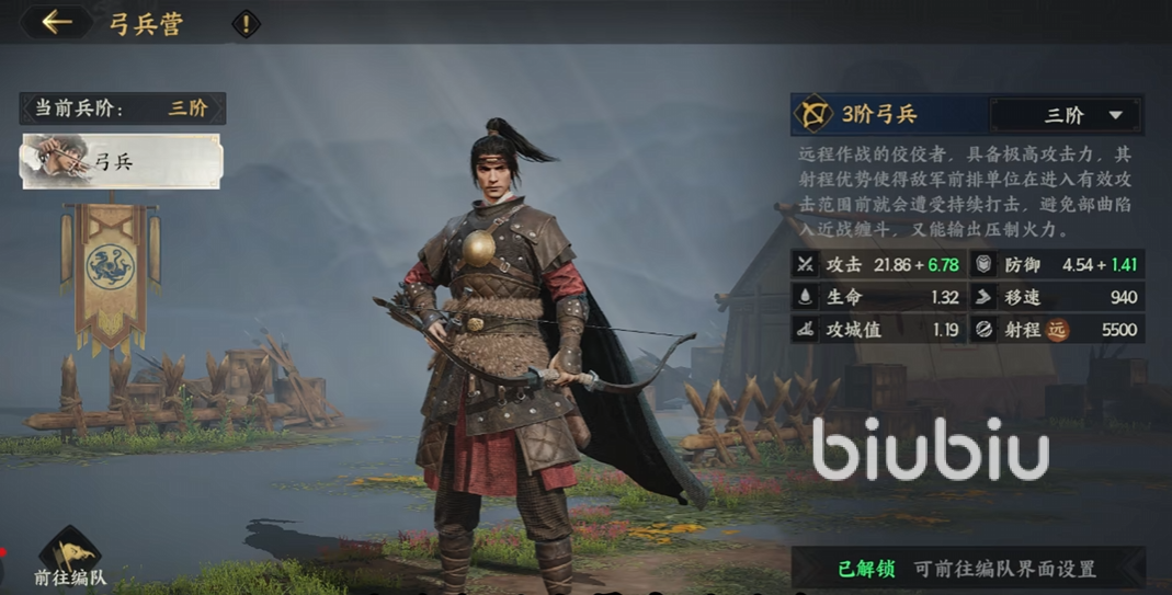 弓兵在游戏当中所占的比例还是比较大的,作为主要武力输出来源,拥有远程攻击的能力,往往可以忽视地形状况,比如水域或者是高地,在6km范围内进行输出,可以持续性的造成攻击。五阶的兵基础攻击数值会达到21.25,再加上一些输出提升,在三类兵种里面输出上限比较高。不过建议使用工兵时搭配盾兵形成保护带,不然很容易被对方的骑兵突袭。