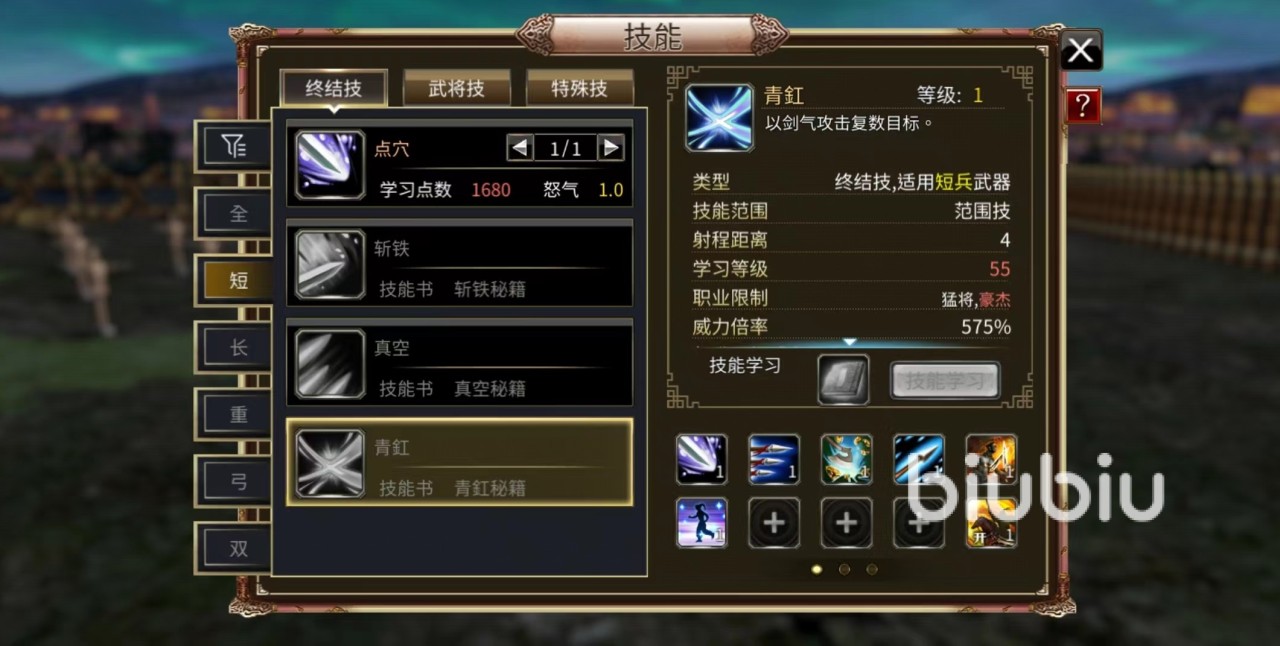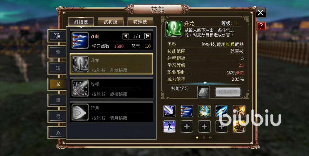 作为全能型的英雄,可以使用的武器自然非常多,和猛将一样,所有武器几乎都可以使用。当使用短兵器的时候,具有独真空和青缸等技能,以剑气来攻击单一或者是多个目标。使用长兵器的时候具有升龙、斩月等技能,升龙可以在敌方的底下冲出斗气之龙伤害多个目标,斩月是挥出半圆状的刀气伤害多名敌人。这些技能都可以有效杀伤敌人,在群攻和单体攻击方面都有出色表现。