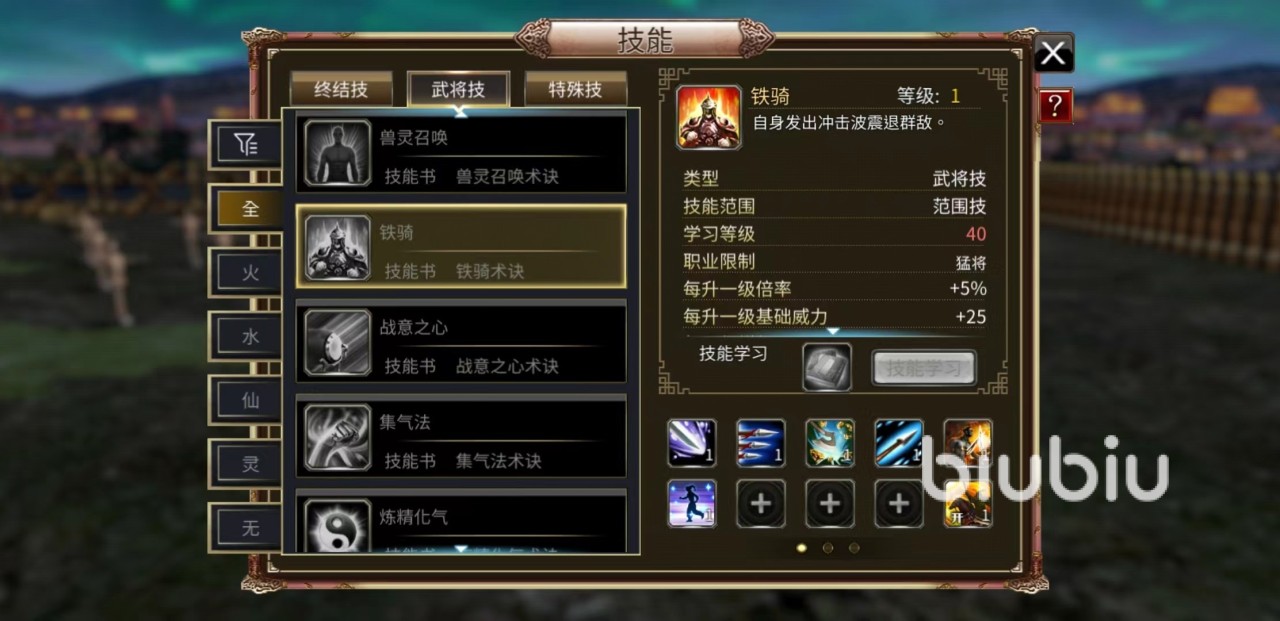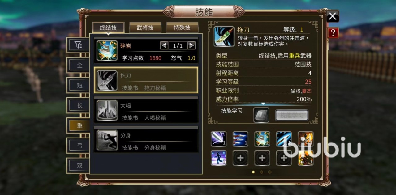 第1个技能拖刀,属于终结类型,重兵器类,通过点地来进行攻击,转身一击发动攻击,伤害敌方多个目标,在敌方群体中释放伤害非常可观。第2个技能旋缨,属于长兵器类,以自身为中心回转产生威力巨大的龙卷风,能伤害多个目标。第3个技能铁骑,属于武将技能,发射冲击波震退群敌,敌方数量越多,优势也就越明显。