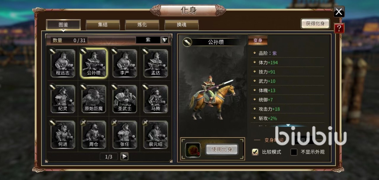 简单来说,使用的方法就是点击换魂,将会转变当前的化身,然后点击确认,会获得当前的化身,只是获取过程需要大家多多努力。换魂列表中的武将比较多,包括周仓、公孙瓒、孟达、刘表、苏飞、黄祖等,有非常多的选项,他们的概率都是3.22%。不同化身都有不同的能力,具体该选择哪一个就要看自己当前的职业和其他的需求来确定。