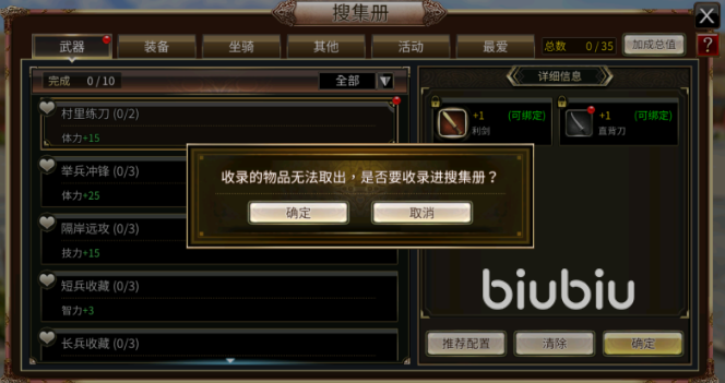 首先是搜集册基本介绍,这个搜集册能收录特定的武器、装备、坐骑等物品,从而帮助玩家的角色获取永久数值加成,不过需要注意的是放入搜集册中的物品,只要点击确定才能真正收录到收集册中,而且收录至搜集册的物品将会彻底消失,无法取出。
