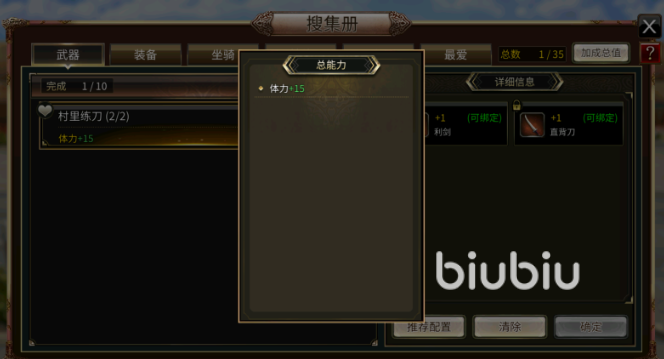 已经放入还没有确定收录的物品,只要按下清除按钮就会返回背包,如果有些物品的需求是指定强度的物品,大家可以按照需求放入任意物品,比方说搜集册需要强度等级40到60级的短兵类,玩家可以放入40级的龙渊剑,也可以放入50级的苍羽扇。