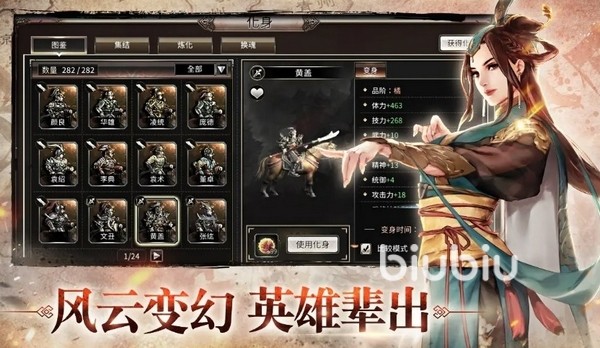 在游戏中玩家可以化身名将,通过培养各类士兵,排兵布阵来搅动三国风云。独特的化身系统,可以让玩家变化身形,不仅有属性加成,造型也会随之变化。武魂系统的推出更是能获得各种名将的独门绝技。