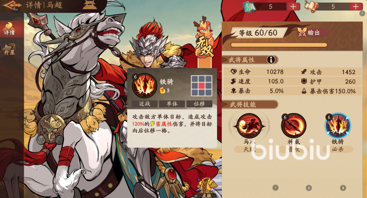 马超是隶属蜀国的无双英雄,定位是近战和单体输出,而且具有特色的雷电元素属性伤害,同时对单体命中以后还会将其击退一格,很符合其骑马作战的特性。