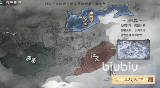 在正式完成角色创建后,就会过一段比较简单的剧情,随后大家就进入到势力选择界面,也就是“落州”,以S1赛季举例,有3大势力可选,魏国的幽冀、蜀国的巴蜀,还有吴国的江东。这几个势力从地图上来看,与较为核心的”司隶”距离差不离,但是这些势力内部城池布局,所处位置都有较大差异,大家可以按照喜好去选择,当然根据系统推荐也是可以的,这是能拿到额外元宝奖励的。