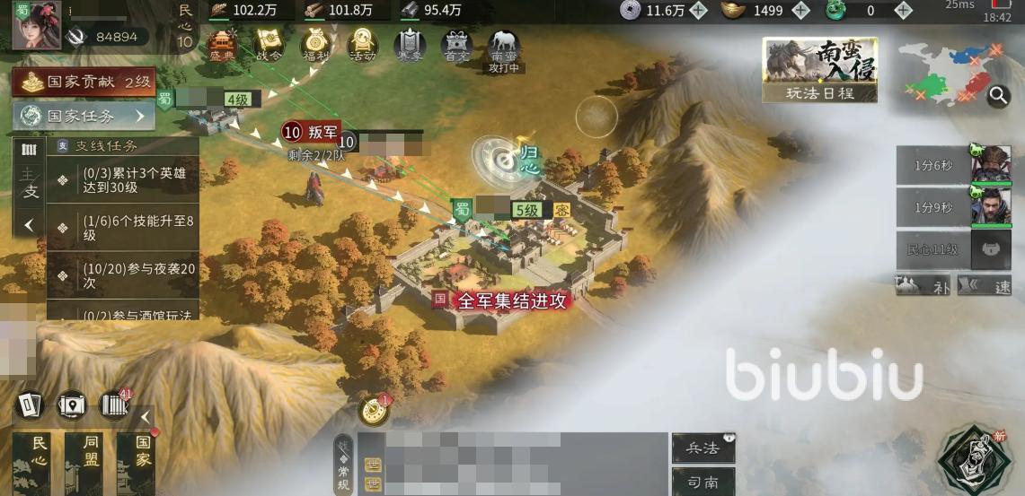 整体的节奏被大大压缩了,进到游戏后就可以很快的参与到领土争夺和大规模的战斗中,避免了长时间等资源、等建筑的疲劳感。战斗方面则是经典的九宫格布阵与追击机制,三线九宫的战场结构非常直观。