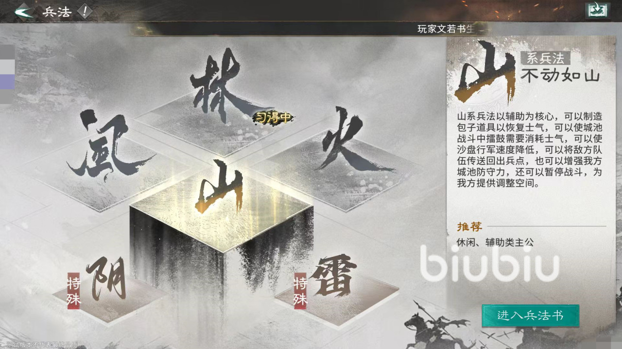 接下来是山系兵法,特点是以辅助为核心,可以制作出道具恢复士气,也可以使沙盘行军速度降低,将敌方队伍传送回出兵点,或者是增强我方城池防守力,还可以暂停战斗,这样给我方调度调整带来帮助。这个兵法就比较适合休闲和辅助类型的主攻去选择。第三个是火系兵法,是以战斗为核心,能够制作出战鼓等道具,直接剿灭城防军,在连胜的时候可减少士气消耗,战斗中直接能恢复兵力。还可以创建出自己队伍的幻影协助进行作战,也可以让自己的队伍直接锁定战场中敌方最高战力的队伍快速斩首。还可以将敌方队伍传送到任意城池。适合喜欢战斗和增强类型的主公选择。