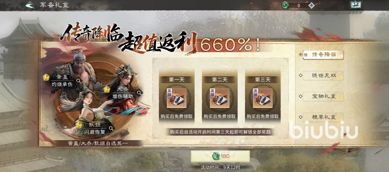 除了上面所说的直接福利,还有开服庆典活动,包括军备礼盒,七日启程,招兵买马和连充赠礼。军备礼盒主要有粮草礼盒、宝物礼盒等,涉及到的都是各种资源,各种宝物,还有顶级武将英雄。通过礼盒购买购买的形式,就可以轻松获得超额奖励。可购买的英雄礼盒中,主要包括黄盖、大乔、甄姬、郭嘉、袁绍、关羽等,都是很多阵容的核心。这样只需要很少的代价,就能在前期快速拿起一套阵容。今日启程是在开服之后的7天时间内,每天都会开放很多任务,完成任务之后就能拿到。英雄碎片,技能碎片等各种奖励。