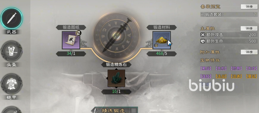 在游戏中玩家获得武器的方式主要是武器锻造来获得,锻造分为普通锻造和精炼锻造。普通锻造主要消耗图纸、材料和银币,精炼锻造还需要消耗精炼石。在图纸上选择普通图纸会有机会解锁稀有套装,想要打造指定武器的话需要特定图纸才能精准锻造。龙泉宝剑这把武器的话算不上武将的专属武器,玩家解锁的难度不大,而且很有可能会成为其他专属武器后续升级的狗粮。