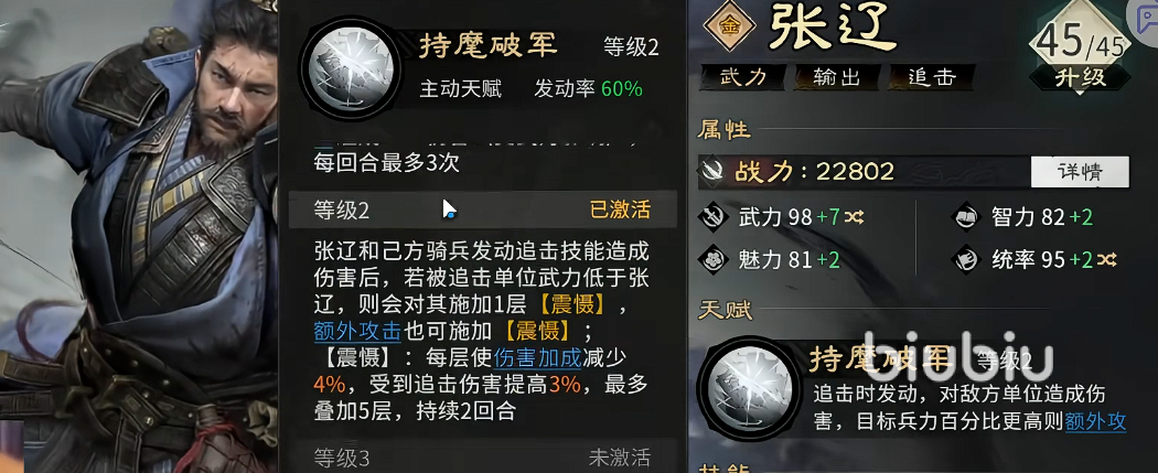 而张辽则是追击队伍的输出核心,主要是因为他的觉醒技能在触发追击的时候可以获得额外的伤害,还能叠加自身的攻击属性,相当于承当了队伍一半的输出,而追击队伍在目前游戏的环境中还是较为强力的,那么张辽的培养价值就很高的,基本上pve还是pvp都是能上追击队伍的。
