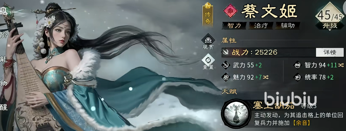关于觉醒技能方面很推荐使用蔡文姬以及张辽的,这两个武将的优势就在于比较全面,而且新手阶段就直接送,不需要任何的培养成本,觉醒技能也几乎是白送的,其中蔡文姬的觉醒技能可以提高我方兵力的属性,同时还很适配追击队伍,能快速缓解追击队兵力不足的情况。