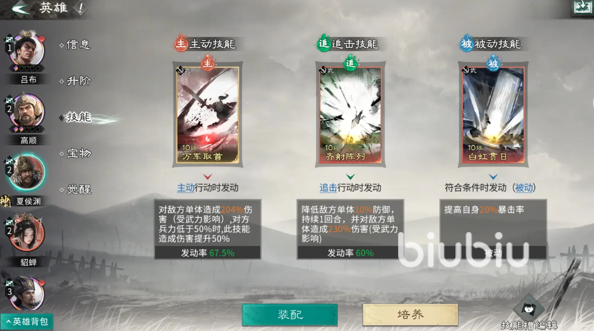 武将组合方面,建议是可以去考虑夏侯渊来作为主C,负责核心输出,依赖暴击以及降防技能提升伤害,然后就是貂蝉打辅助,提供增伤、混乱控制及治疗,天赋闭月之貌能为夏侯渊提供45%增伤,且有几率使其额外触发两次追击,高顺作为副辅,不仅能提升追击频率以及出色的生存能力,他的主动技能还可为夏侯渊增伤,被动提供前期伤害抵挡,整体的表现很是不错。